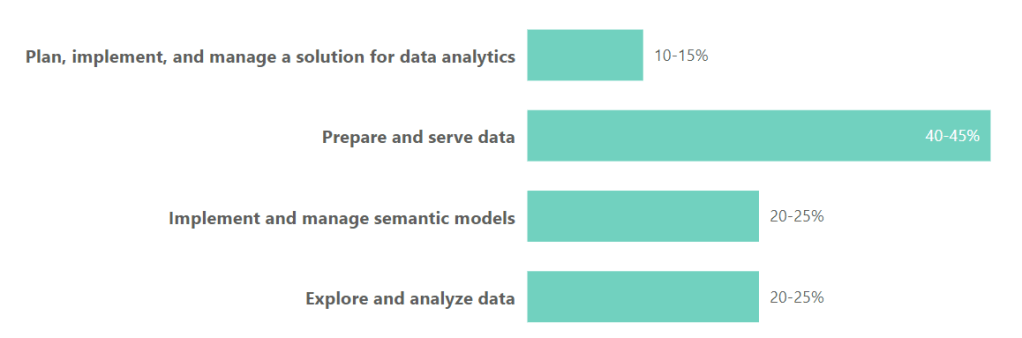 This is the largest part of the exam and mainly concerns data engineering tasks, namely ingesting, transforming, and loading data into a lakehouse or warehouse.
